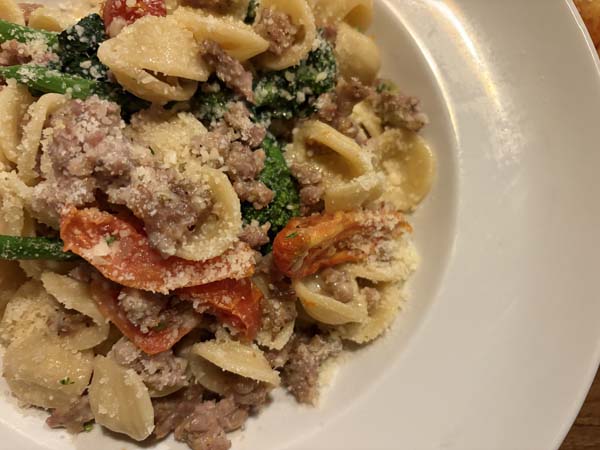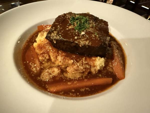 Our delightful server steered us to the best of the menu. Crispy artichokes were delectable with a lemony bite. Arancini, which in my mind can be a big hit or a big miss, were perfect here, with toothsome risotto studded with pancetta in a light, crispy crust. Delish! My short rib, in a pool of cheesy polenta, was the ultimate in comfort food. Laura’s orechiette with broccoli rabe and sausage was a delight; napped in broth rather than cream, making it a lighter take on this often heavy dish.
