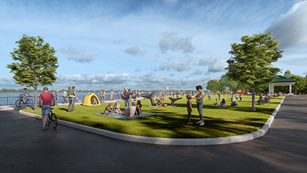• A Green Space for Families: Open lawns for picnics, kite-flying, volleyball, public art, kayak launch, and community pavilion.