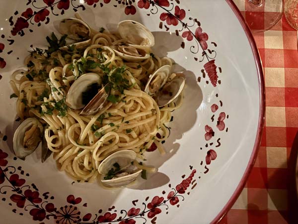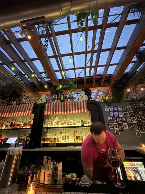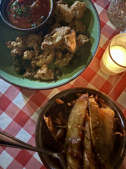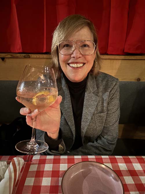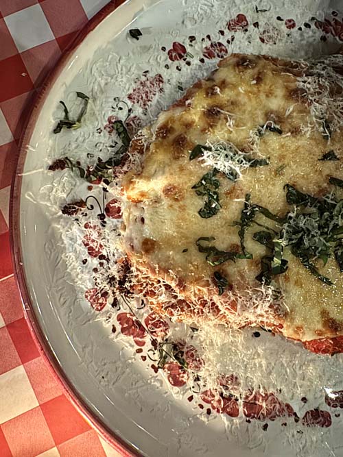 The concept this winter (running through April) is all about family-style Italian American feasts, elevated by the freshest ingredients and the chefs’ skill. The Radicchio Salad arrived first, a vibrant mix of bitter greens, tangy blue cheese, and sweet balsamic. I mistakenly went back for seconds before the next course, Potato Scarpariello, appeared. These twice-cooked potatoes were crispy on the outside and so creamy on the inside, tossed with sautéed onions and peppers. We begged the chef for the recipe. If potatoes could be a revelation, these were. I slurped up the buttery, briny Linguine and Clam sauce (one of my all-time favorite dishes), and here it was perfection with the addition of shallots and chili flakes. Delightfully, on offer were both of our favorites, and while I had a bite of the mammoth Chicken Parmesan, Laura was having her own party. The portions were so generous, we left with enough for days of delicious leftovers.