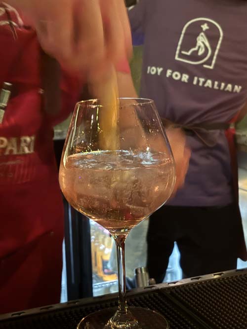 The cocktails are Italian-inspired, and we were happy to imbibe (damp January!) The Rossini Spritz had my name on it; an Aperol-based concoction, fizzed with Prosecco and topped with a cloud of strawberry foam. Laura’s Strawberry Snow was a bit stronger: gin and Chamberyzette with botanical notes and tonic.