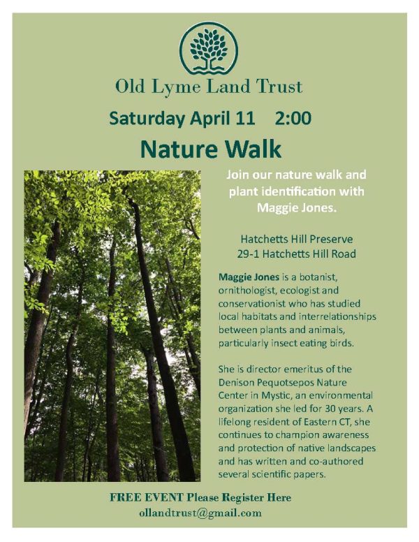 Take a walk on the wild side! Join the Old Lyme Land Trust for a guided nature walk and plant identification with Maggie Jones, discover the beauty of local trails and learn what’s growing around you.