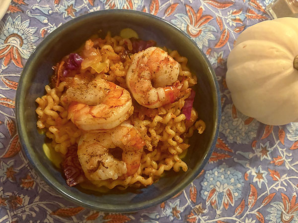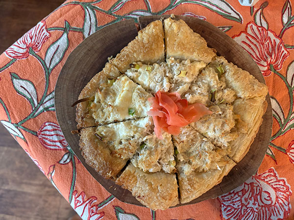 The dining room is cozy and colorful, filled with hanging flowers, vintage accessories and tables topped with various block-printed linens. We sipped a Provencal rosé at a quiet table and decided on several courses of seafood despite the temptation of Whole Stuffed Pumpkins (with wild mushrooms and asian greens), Wild Mushroom Stroganoff, and Pasta Bolognese. We started with a scrumptious Crab Rangoon Tart made with a flaky crust and filled with crab, scallion, cream cheese, and topped with pickled ginger. It was impossible to resist the Kim Chi Carbonara – fusilli tossed with red cabbage and parmesan and perfectly spiced, plump shrimp. And for the main event, we shared a stunning platter of whole Roasted Trout with crispy potatoes, broccolini, and horseradish cream. We were too stuffed for dessert but made off with LBA’s signature scones for later.
